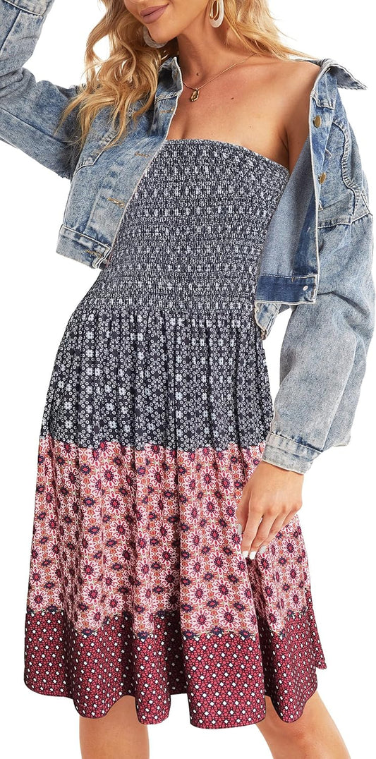 Womens Summer Sundress Cover Ups Casual Strapless Boho Flower Printed Sleeveless Tube Dress (Red11,M)